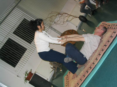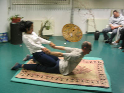 Pierwszy etap pokazów to były uciski wzdłuż charakterystycznych dla tego masażu linii na nogach. Nie są one jakieś wymyślnie skomplikowane i łatwo je zapamiętać, bo przebiegają zazwyczaj wzdłuż obrysu mięśni lub ścięgien. Prowadzą od przyczepów jednej grupy do drugiej itd. Uciskasz dwoma kciukami i tyle. No właśnie. Jak się już tak kilka godzin nauciskałem, to chciałem jechać do domu. Myśleliśmy z kumplami, że to będzie takie tam fiki miki, i tu nas Kanya zaskoczyła.