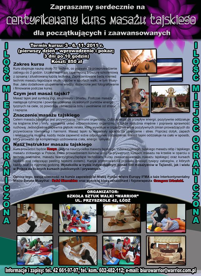 Kurs odbędzie się w terminie od 3 do 6 listopada 2011 r. w siedzibie Szkoły Sztuk Walki "WARRIOR" przy ul. Przyszkole 42 w Łodzi. Obejmował będzie naukę ok. 75 technik masażu tajksiego - 3 dni po 10 godzin. Na pierwszy dzień kursu przewidziane jest wprowadzenie oraz prezentacja.